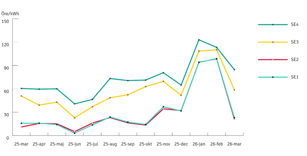 Starten av året 2026, januari och februari, resulterade i ett högt rörligt pris i SE3 och SE4. Detta orsakades av en kall vinterperiod med lite vind, ett tydligt exempel på hur en kall vinters elpriser blir när andelen import av el ökar och elpriset därmed kopplas till gaspriset i större utsträckning. Mars månad har istället innefattat en hel del lågtryck och vind – vilket trycker ner de extrema pristopparna på marknaden. Snittpriset på börsen gick från över 100 öre/kWh januari och februari till 58,66 öre/kWh i i SE3 för mars.