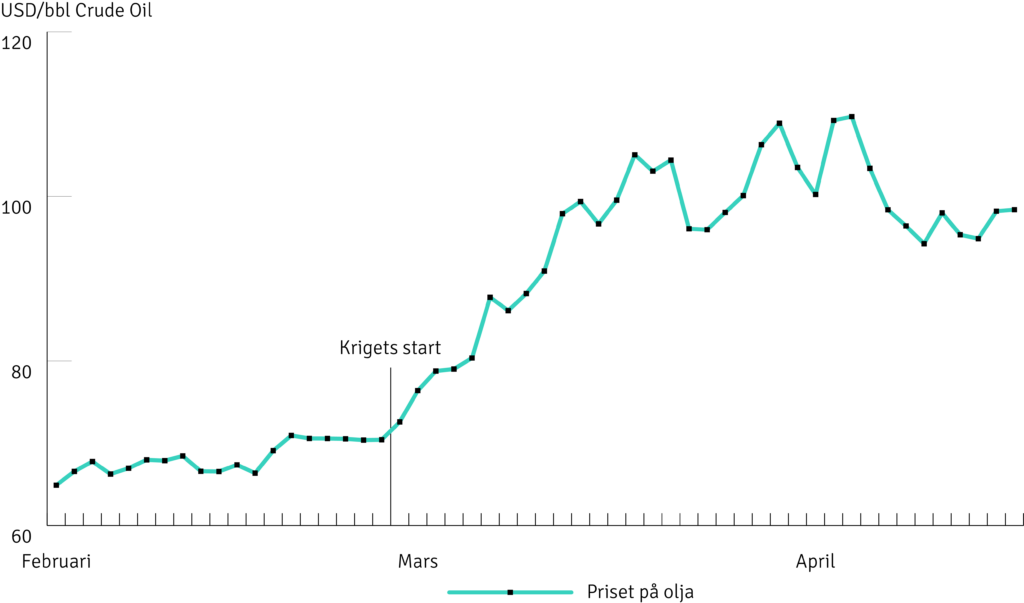 Oljepriset har under mars gått från 50-60 dollar/fat en tid innan krigets start upp till över 100 dollar/fat.